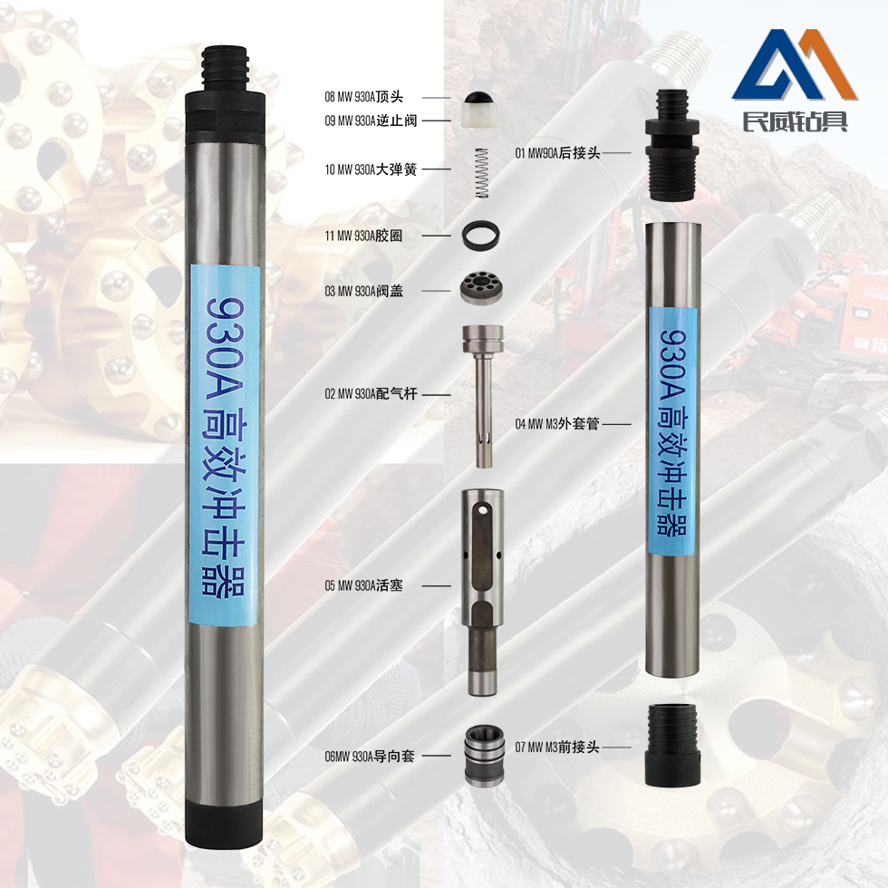 民威系列中风压冲击器使用寿命长、使用成本低、次冲击功大、活塞与钎头的重量接近,有极好的动量传递,在结构设计上采用现代理论,使应力波持续时间长,应力振幅较低,活塞寿命长。
