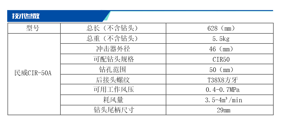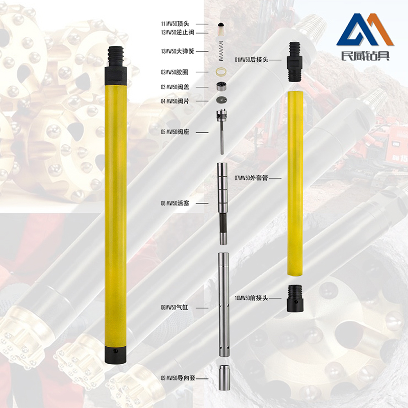民威CIR系列冲击器是根据中国矿山及工程凿岩的实际情况,专为矿山及工程施工中的低风压钻机设计,在结构设计上采用现代理论,使应力波持续时间长,应力振幅较低,活塞寿命长。